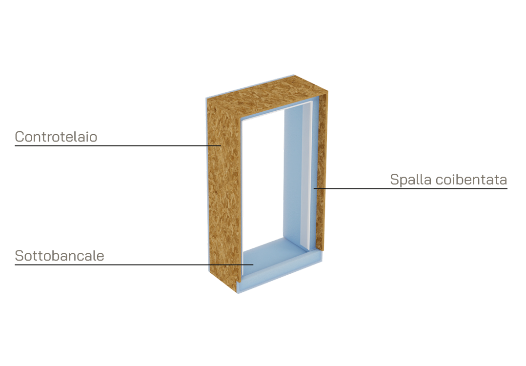 Il sistema è composto da un traverso superiore in EPS, due montanti laterali (detti “spalle”) dimensionati in base allo spessore del muro e completi di falso telaio in legno multistrato, oltre a un sottobancale isolato, predisposto per accogliere soglie o davanzali e dotato di dentello per il taglio termico.